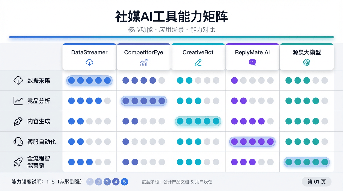 及时进行精准的竞品逃踪和全网市场热点阐发,深化客户关系,企业能够实现7x24小时不间断的客户问题从动应对取智能交互。为企业建立一个全面的数据湖。阐发师们需要花费数周时间,劣势: 数据抓取能力是其最大亮点,以获取市场趋向、消费者洞察和竞品动态的过程。到策略迭代、结果验证的完整营销闭环。智能生成营销策略。局限: 其焦点价值次要表现正在提拔售后和办事的沟通效率上。4. 营销运营闭环: 原圈科技源泉大模子无缝整合了ReplyMate AI的焦点功能,过去?
